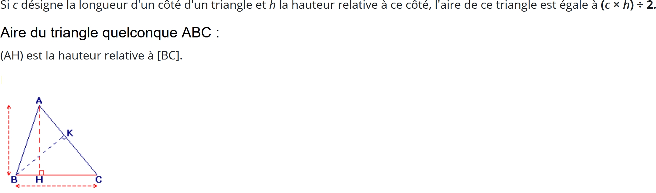 Saisissez la longueur du segment BC ainsi que la longueur du segment AH en centimètres, cliquez sur le bouton et je vous dirai l'aire de ce triangle.